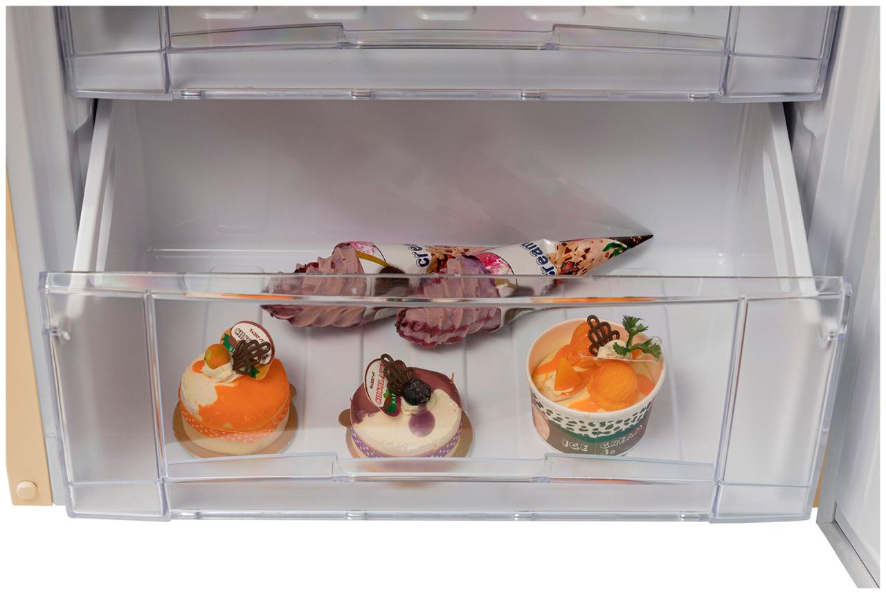 - 3 прозрачных ящика в морозильном отделении позволяют поместить и длительно хранить большие куски мяса, курицу, полуфабрикаты и другие объемные замороженные продукты;