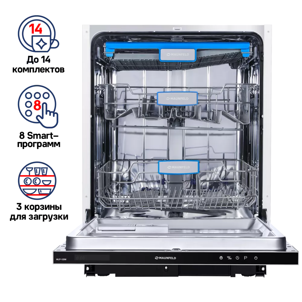 Полноразмерная встраиваемая посудомоечная машина MAUNFELD MLP-12IM сочетает в себе современный дизайн и высокую функциональность. Она оснащена специально разработанными корзинами и дополнительным выдвижным лотком для столовых приборов, что позволяет вымыть до 14 комплектов посуды за один цикл. Внутренняя поверхность из нержавеющей стали толщиной 0.6–0.8 мм гарантирует долговечность и надежность даже при активной эксплуатации.