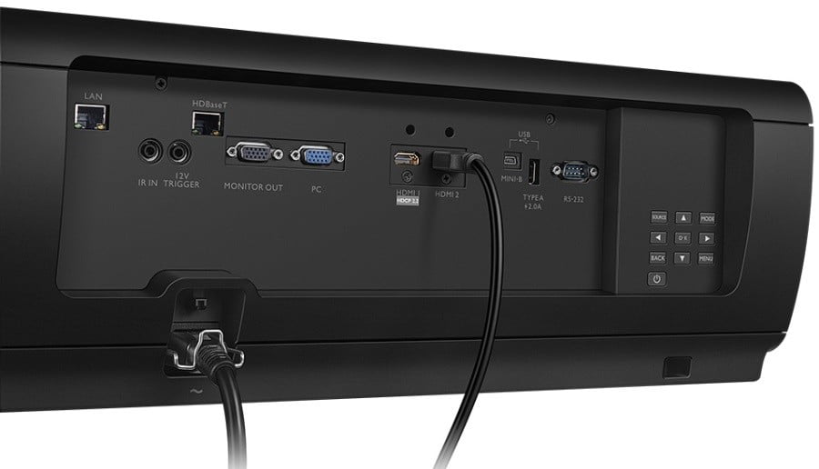 Аудиовыход (мини-разъем) x1, выход монитора (D-sub) 15-контактный, гнездо) x1, вход ПК (15-контактный разъем D-sub, гнездо) x1, HDMI 1 (4K, HDMI 2.0 и HDCP 2.2) x1, HDMI 2 (HDMI 1.4 и HDCP 1.4) x1, HDMI 3 (HDMI 1.4 и HDCP 1.4) ) x1, HDMI Out x1, 12V Trigger x1, USB Mini-B (Service) x1, USB Type-A (питание 2A) x1, вход RS232 (9-контактный D-sub, штекер) x1, ИК-приемник (спереди) x1, IR Приемник (сзади) x1