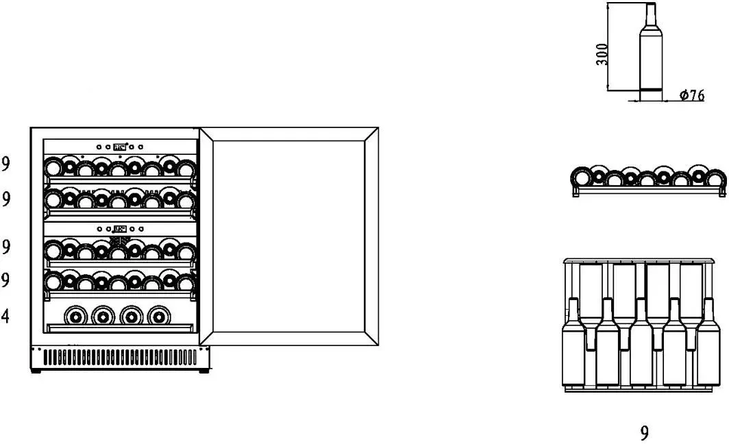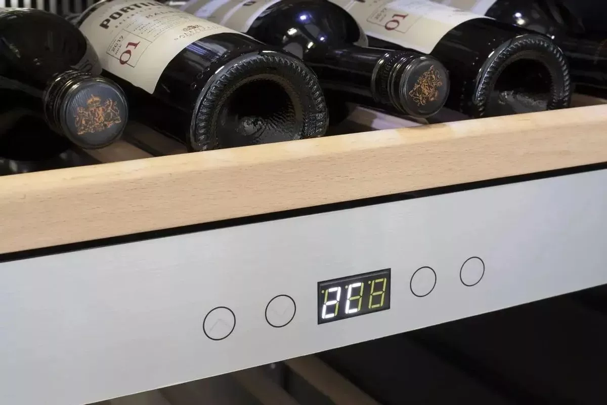 Пять съемных полок из дерева предназначены для правильного хранения вина: бутылки кладутся горизонтально (вместительность – 40 бутылок). Деревянные полки оборудованы фиксаторами от самопроизвольного выдвижения и компенсируют механические воздействия компрессора и вентилятора. Параметры холодильника задаются вручную, а также при помощи мобильного приложения «CASO-App». Возможна удаленная смена настроек из любой точки мира. Управление осуществляется при помощи двух сенсорных панелей.  Регулировка температурных показателей с шагом в 1°C происходит нажатием « ∧ » и «∨». Управление внутренним освещением возможно при помощи кнопки «Свет». Встроенные светодиоды не нагреваются, и внутренний микроклимат остается максимально благоприятным для хранения бутылок.