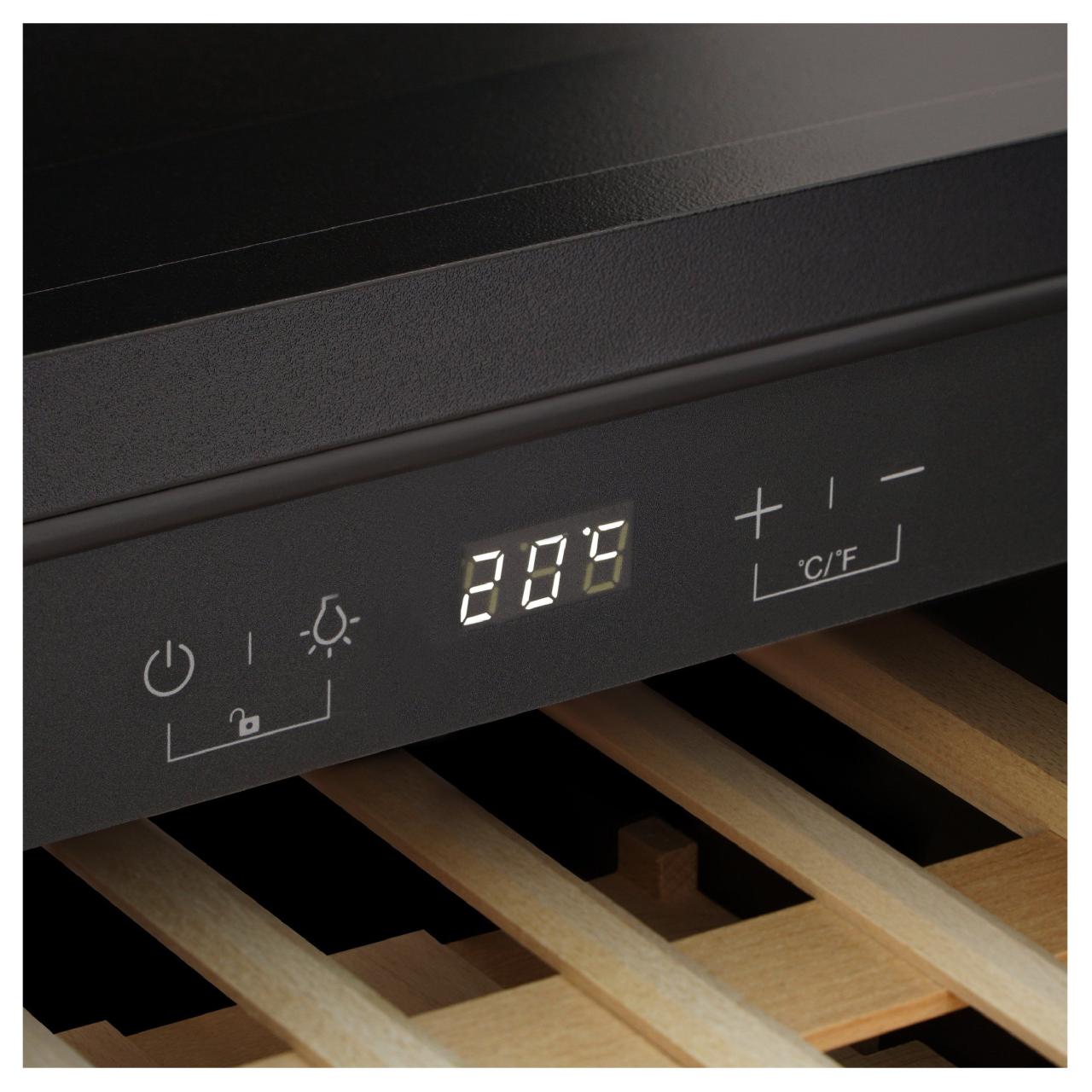 Внутреннее LED-освещение подчеркивает внешний вид бутылок и делает процесс выбора вина удобным и простым. Кроме того, шкаф оснащен функцией сенсорного управления, которое позволяет легко и быстро настроить нужную температуру. Диапазон температур от +5 до +20 градусов Цельсия обеспечивает идеальные условия для хранения различных видов вина. Вместимость шкафа составляет 28 бутылок, что позволяет хранить великолепную коллекцию вин. Две деревянных полок обеспечивают удобное размещение бутылок.